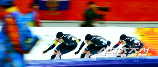 이승훈, 주형준, 김철민 등 남자 스피드 스케이팅 대표팀 선수들이 21일 소치 해안 클러스터의 아들레르 아레나에서 열린 남자 팀추월 캐나다와의 준결승 경기에서 질주하고 있다. 소치(러시아)=김경민 기자 kyungmin@sportschosun.com / 2014.02.22.