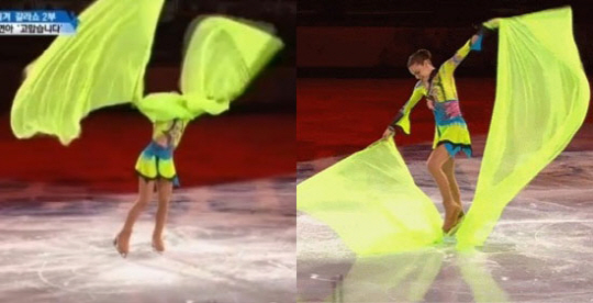 깃발의 무게를 이기지 못 한 소트니코바는 느릿한 움직임을 보였고, 스핀에서도 깃발로 얼굴을 가리는 황당한 모습을 연출했다. 또한 깃발에 스케이트가 걸려 휘청거리며 중심을 못 잡는 것은 물론 깃발을 내려둔채 펼친 연기에서도 하지만 마지막까지 미끌거리며 실수를 연발했다.