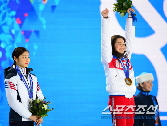 여자 피겨 스케이팅 대표팀의 김연아(왼쪽)가 22일(한국 시간) 오후 소치 올림픽 파크에서 진행된 여자 싱글 경기의 메달 세리모니에서 은메달을 수여받은 가운데 아델리나 소트니코바(금메달·러시아)가 환호하고 있다. 소치(러시아)=김경민 기자 kyungmin@sportschosun.com / 2014.02.22.