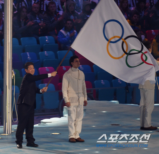 2014 소치 동계올림픽 폐막식이 24일 오전(한국시간) 러시아 소치 피시트 올림픽 스타디움에서 열렸다. 폐막식에서 이석래 평창 군수가 오륜기를 흔들고 넘겨받고 있다. 소치(러시아)= 김경민 기자 kyungmin@sportschosun.com / 2014.02.24.