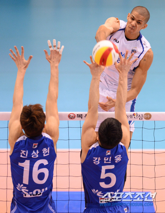 2013-2014 프로배구 V리그 삼성화재와 대한항공의 경기가 23일 대전충무체육관에서 열렸다. 삼성화재 레오가 대한항공 진상헌, 강민웅의 블로킹 사이로 스파이크를 강타하고 있다. 대전=최문영 기자 deer@sportschosun.com /2014.02.23/
