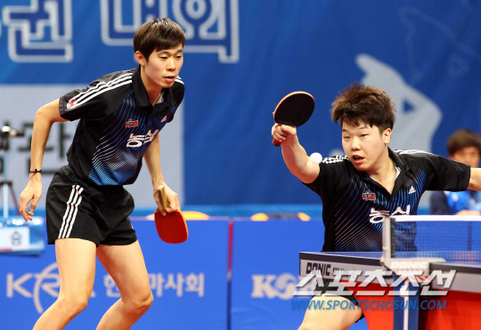 ◇지난해 12월말 전국남녀종합선수권 남자복식 결승에서 농심의 이정우-최원진조는 우승컵을 들어올렸다. 사진제공=월간탁구 안성호 기자