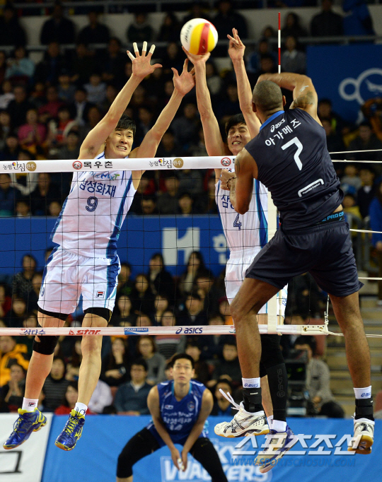 현대캐피탈과 삼성화재의 2013-2014 프로배구 경기가 22일 천안유관순체육관에서 열렸다. 현대캐피탈 아가메즈가 삼성화재 이선규 류윤식의 블로킹을 앞에 두고 공격을 시도하고 있다. 천안=허상욱 기자 wook@sportschosun.com/2014.01.22/