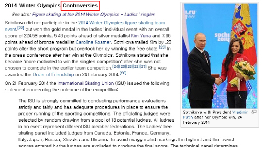 전세계적으로 가장 광범위한 영향력을 갖고 있는 온라인 백과사전 '위키피디아'가 아델리나 소트니코바(러시아)의 소치 올림픽 여자 피겨 금메달 논란을 정식으로 등재했다 일주일 만에 삭제했다.