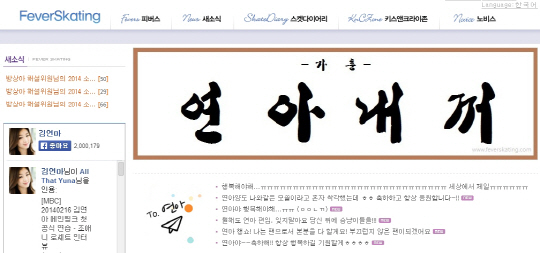 김연아 팬을 중심으로 구성된 유력 피겨 스케이팅 포럼 '피버스케이팅'은 김연아의 열애설이 알려진 6일 오후 메인페이지에 멋진 궁서체로 '연 아 내 꺼'란 가훈을 내걸었다.