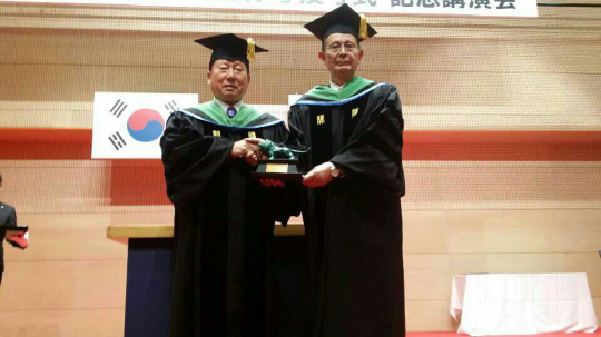 김정행 대한체육회장(사진 왼쪽)이 7일 오후 3시 일본체육대학교 기념관에서 일본체육대학교(총장 다니가마 료우쇼)부터 체육과학 명예박사 학위를 받았다.