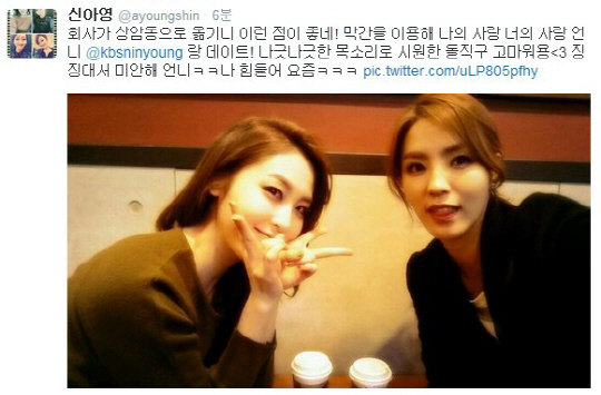 사진과 함께 게재된 글에는 "회사가 상암동으로 옮겨 이런 점이 좋네. 막간을 이용해 나의 사랑 너의 사랑 언니와 데이트. 나긋나긋한 목소리로 시원한 돌직구 고마워용"이라며 "징징대서 미안해 언니 힘들어 요즘" 이라는 글이 올라와 있다.