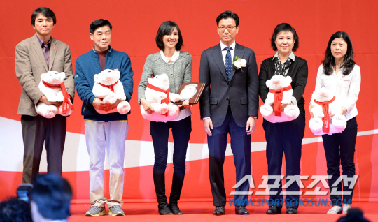스포츠조선과 한국 코카·콜라가 제정한 제19회 코카콜라 체육대상이 12일 서울 웨스틴조선호텔 그랜드볼룸에서 열렸다. 우수단체상을 수상한 쇼트트랙 여자대표팀 가족들(심석희 아버지, 김아랑 아버지, 박승희 어머니, 김재열 빙상연맹회장, 조해리 어머니, 공상정 어머니(왼쪽부터)이 포즈를 취하고 있다. 쇼트트랙 대표팀은 세계선수권대회에 출전한 관계로 시상식에 참석하지 못했다. 김경민 기자 kyungmin@sportschosun.com/2014.03.12/