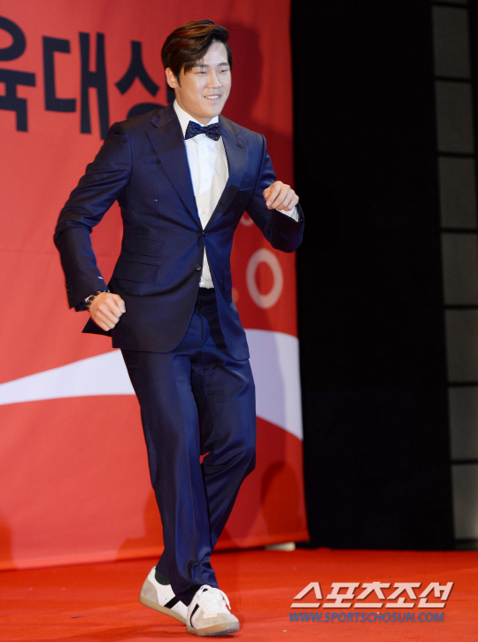 스포츠조선 제정 제19회 코카콜라 체육대상이 12일 소공동 웨스틴조선호텔에서 열렸다. 코카콜라 체육대상 신인상을 수상한 모굴스키 최재우 선수가 셔플댄스를 추며 장기자랑을 펼치고 있다. 아마스포츠 최대의 시상식으로서 올해로 19회째를 맞는 코카콜라 체육대상은 황영조, 이봉주(이상 마라톤) 전이경(쇼트트랙) 김영호(펜싱) 유승민(탁구) 박태환(수영) 장미란(역도) 양학선(체조) 김재범(유도) 등 한국 스포츠사의 영웅들이 최우수선수상(MVP)의 위대한 계보를 이어왔다. 소공동=최문영 기자 deer@sportschosun.com