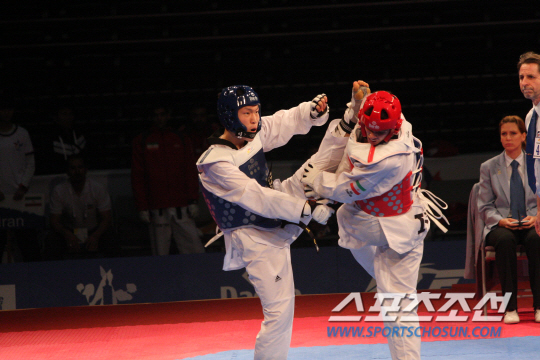 ◇변길영(왼쪽)이 25일 대만 타이페이 타이페이 아레나에서 열린 제10회 세계청소년태권도대회 남자 -78kg급 결승전에서 아미로세인 오미디(이란)의 머리을 가격하고 있다. 타이페이(대만)=박찬준 기자