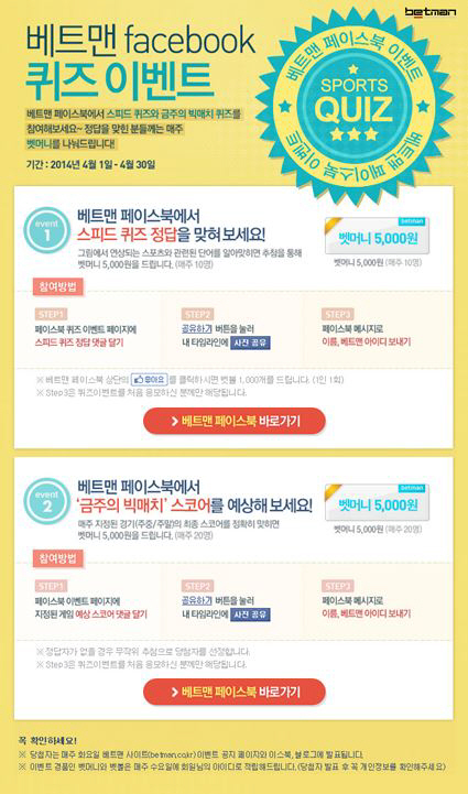 국민체육진흥공단(www.kspo.or.kr)이 발행하는 체육진흥투표권 수탁사업자인 스포츠토토 공식 온라인 발매 사이트 베트맨(www.betman.co.kr)이 4월 '페이스북 퀴즈 이벤트'를 실시한다고 밝혔다.