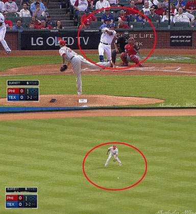 1번타자 겸 좌익수로 선발출장한 추신수는 꽉 찬 풀카운트에서 상대 선발 A.J.버넷의 93마일(150km) 빠른 공을 그대로 때려내 중견수 앞 안타로 연결했다.