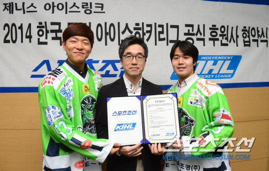 박진형 편집국장(가운데)이 3일 열린 2014년 제니스 아이스링크 한국 독립 아이스하키리그 공식 후원사 협약식에서 웨이브즈 관계자와 기념촬영을 하고 있다. 조병관기자 rainmaker@sportschosun.com/2014.04.02/