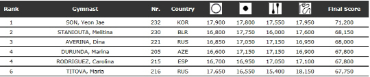 손연재는 침착한 연기를 선보이며 후프에서 17.900점, 볼에서 17.800점, 곤봉에서 17.550점, 리본에서 17.950점으로 전종목 17점대 후반를 기록했다. 나홀로 총점 70점을 넘어섰다. 리본에서 절대 에이스의 점수인 18점를 0.05점 차로 넘지 못한 점은 아쉬웠다.