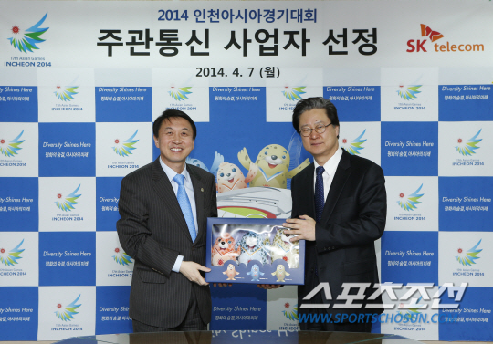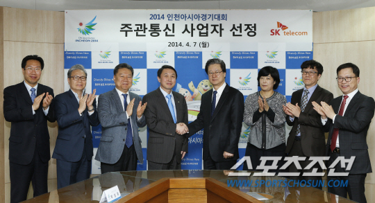 인천아시안게임 조직위원회는 7일 오후 송도 미추홀타워에서 SK텔레콤과 주관통신 사업자 계약을 체결했다. 권경상 조직위 사무총장과 이명근 SK텔레콤 부사장이 대표로 참석해 성공적인 대회 개최를 위한 상호협력과 지원을 약속했다.