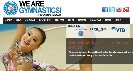 국제체조연맹(FIG) 홈페이지가 8일 '리스본월드컵 4관왕' 손연재(20·연세대)를 공식 홈페이지 메인화면에 내세웠다.