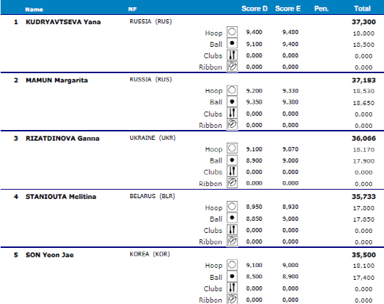 '리스본 4관왕' 손연재가 후프-볼 2종목에서 중간순위 5위를 달리고 있다.