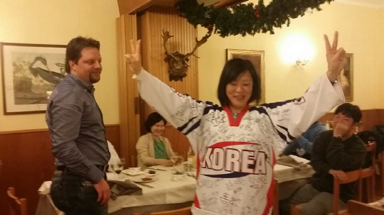 | 아시아고 교민인 전원미씨와 남편 파비오가 선수단으로부터 사인 유니폼을 선물받고 기뻐하고 있다. 사진제공=대한아이스하키협회 |
