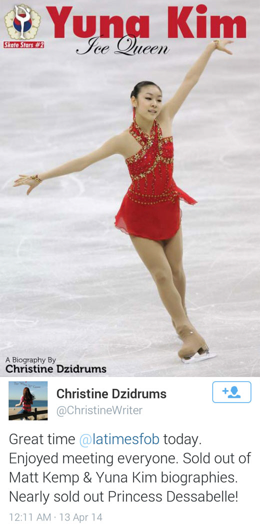 지난 2011년 김연아의 전기 집필을 완료한 미국 아동도서 작가 크리스틴 지드럼스(Christine Dzidrums)는 14일(한국시간) 자신의 트위터에 "오늘 LA타임즈의 북 페스티벌에서 많은 사람들을 만나 즐거운 시간을 보냈다"면서 "매트 캠프와 김연아 전기가 매진됐고, 데세벨 공주는 거의 매진에 가까웠다"고 전했다.
