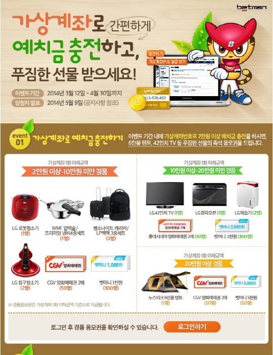 가상계좌 1회 이체금액이 10만원 이상-20만원 미만일 경우 LG42인치 TV(1명), LG광파오븐(1명), LG제습기(2명), 롯데시네마 영화예매권(50명), 벳머니 2000원권(300명)등 다양한 경품이 준비되어 있다. 또한 가상계좌 1회 이체금액 2만원 이상-10만원 미만과 20만원 이상 충전 시에도 각각 푸짐한 선물을 증정한다.