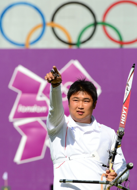 개인전 첫 금메달에 도전하는 남자 양궁 대표팀이 3일 런던 로즈크리켓 그라운드에서 남자 양궁 개인전을 펼쳤다. 오진혁이 금메달을 획득했다. 결승전에서 승리가 확정되자 기뻐하고 있는 오진혁. 20120803런던=올림픽사진공동취재단 |