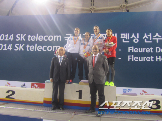 ◇27일 SK텔레콤 국제그랑프리 펜싱선수권 여자플뢰레에서 나홀로 동메달을 획득한 '베테랑 에이스' 정길옥(오른쪽 끝). 우승자인 발렌티나 베잘리, 2위 아리아니 에리고, 3위 마르티나 바티니 등 이탈리아 에이스 3명과 나란히 시상대에 올랐다. 손길승 대한펜싱협회장(SK텔레콤 명예회장)이 직접 시상했다.