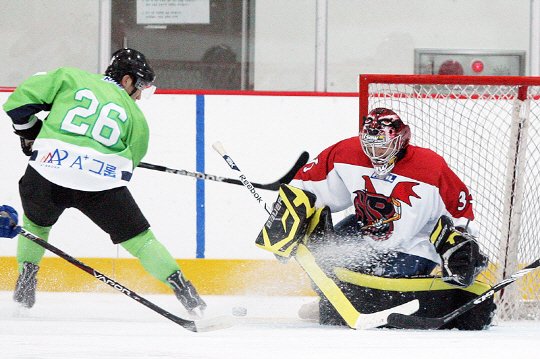 지난 26일 서울 제니스 아이스링크에서 열린 '2014년 제니스아이스링크 한국독립아이스하키리그' 2라운드 첫 경기, 블레이저스의 골리 김영우가 경기 전부터 링크에 모인 사람들의 시선을 사로잡았다. 자신의 장비에 노란색을 입혀 나타났기 때문이다.