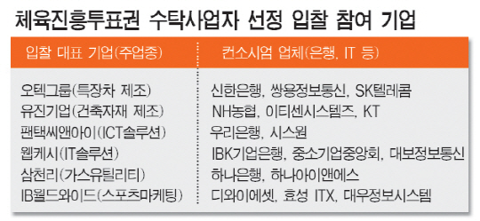 스포츠토토 사업자를 선정하는 기관인 국민체육진흥공단과 조달청에 따르면 8일 오전 마감된 입찰에 오텍그룹, 유진기업, 팬택씨앤아이, 웹케시, 삼천리, IB월드와이드가 대주주로 참여하는 6개 컨소시엄이 경쟁에 뛰어들었다.