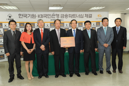 14일 성동구 홍익동 한국기원 2층 대회장에서 열린 금융파트너십 협약식에는 KB국민은행 강문호 전무와 권헌주 상무 김석조 본부장 김용식 마장동 지점장, 한국기원 박치문 부총재 조훈현 이사 양재호 사무총장 김효정 기사회장 등이 참석했다.
