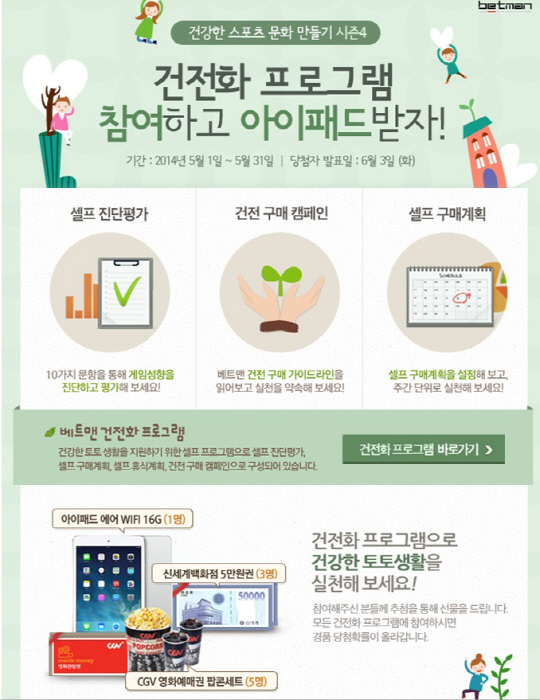 국민체육진흥공단(www.kspo.or.kr)이 발행하는 체육진흥투표권 수탁사업자인 스포츠토토의 공식온라인 발매사이트 베트맨(www.betman.co.kr)이 건강한 스포츠문화 만들기 캠페인 시즌4 '건전화 프로그램 참여하고 아이패드 받자!' 이벤트를 실시하고 있는 가운데 스포츠토토 팬들의 뜨거운 호응을 얻고 있다.