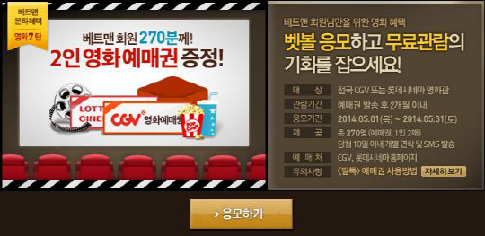 CGV와 롯데시네마 영화관에서 다양한 영화를 관람할 수 있는 예매권을 증정하는 이번 이벤트에는 시작한지 22일만에 2만8000여건이 넘는 응모건수를 기록하는 등 많은 관심을 받고 있다. 예매권의 경우 총 270명에게 1인 2매를 증정하며 당첨 10일 이내에 개별 연락 및 SMS가 발송된다. 이번 이벤트의 응모기간은 31일까지며, 영화 예매권의 경우 발송 후 2개월 이내에 사용해야 한다.