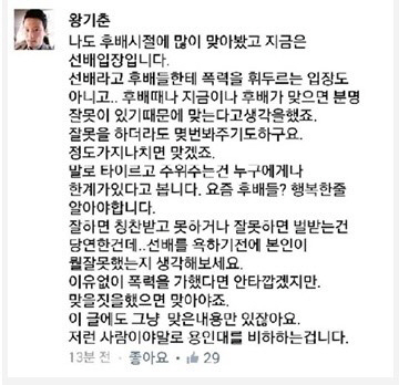 왕기춘은 "이유 없이 폭력을 가했다면 안타깝지만, 맞을 짓을 했으면 맞아야 한다"고 자신의 생각을 밝혔다. 이어 그는 "이 글에도 그냥 맞은 내용만 있다"며 "저런 사람이야말로 용인대를 비하하는 것"이라고 덧붙였다.