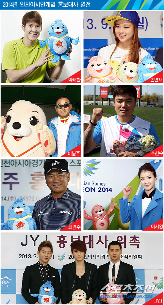 인천아시안게임 조직위는 인천아시안게임의 적극적인 홍보를 위해 대한민국이 자랑하는 스포츠, 연예스타들을 홍보대사로 대거 영입했다. '영원한 마린보이' 박태환(인천시청), '국민 마라토너' 이봉주, '국민 소프라노' 조수미, '국민 탤런트' 최불암, '여배우 복서' 이시영(인천시청), '한류 아이돌' JYJ, '추추트레인' 추신수(텍사스 레인저스), '리듬체조 요정' 손연재(연세대), '코리안 탱크' 최경주(SK텔레콤), '발라드의 귀재' 박강성 등이 2014년 인천아시안게임 홍보대사다. 스포츠 예술 연예 등 다양한 분야에서 남다른 노력으로 정상에 오른 이들이다.