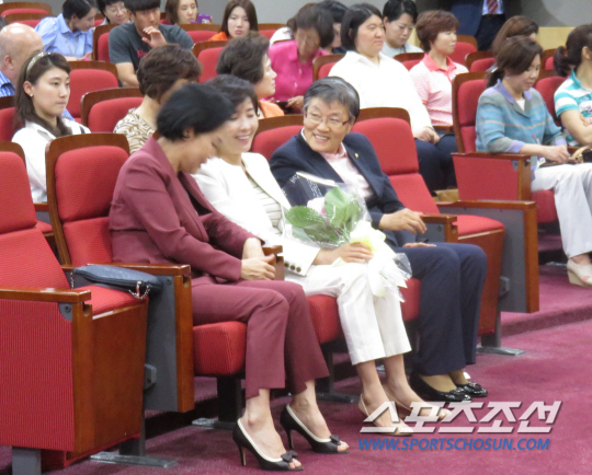 ◇대한민국 여성 체육을 이끄는 파워 스포츠-정치인들이 한자리에 모였다. 이에리사 새누리당 의원, 나경원 전 새누리당 의원, 류지영 새누리당 의원이 '여성체육포럼' 특강에서 담소를 나누고 있다.