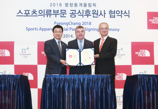 ◇2일 평창 알펜시아 컨벤션센터에서 열린 '2018년 평창동계올림픽 스포츠 의류부분 공식 후원사 협약식'에서 영원아웃도어(노스페이스) 성기학 회장(오른쪽)과 토마스 바흐 국제올림픽위원회(IOC) 위원장(가운데), 김진선 2018평창동계올림픽조직위원장(왼쪽)이 협약서에 서명한 후 기념촬영을 하고 있다. 사진제공=2018년 평창동계올림픽 조직위원회