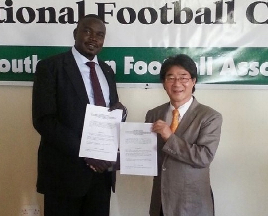 | 지난 1월 14일 남수단축구협회에서 열린 축구대표팀 감독 취임식에서 임흥세 감독(오른쪽)이 알레이 샤부르 남수단축구협회장으로부터 임명장을 받고 있다. |