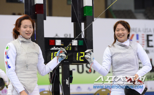 제4회 한미대학펜싱선수권(2014 KUEFI)대회 개인전 준결승과 결승경기가 9일 수원실내체육관에서 열렸다. 여자 플뢰레 4강전에서 맞붙은 쌍둥이 자매인 김은아(동생), 김은이(언니)가 포즈를 취하고 있다. 한국대학펜싱연맹이 주최하고 수원시가 후원하는 한미대학펜싱선수권은 한국과 미국의 대학생 펜싱선수들이 매년 한국에 모여 실력을 겨루고 우정을 나누는 무대로 올해로 4회째를 맞았다. 이번 대회에는 대구대, 대전대, 호남대, 우석대, 부산외대, 호원대, 인천대 등 한국 펜싱명문 7개대와 하버드, 예일, 스탠포드, 컬럼비아, 브라운, 코넬, 프린스턴, 펜실베이니아대 등 미국 아이비리그 명문 11개대의 총 145명(한국 83명, 미국 62명)의 학생선수들이 참가했다. 이번대회는 9일 개인전 경기를 통해 남녀 플뢰레, 에페, 사브르 종목의 챔피언을 가린후 단체전 경기가 예정된 10일까지 이어진다. 수원=최문영 기자 deer@sportschosun.com /2014.07.08/