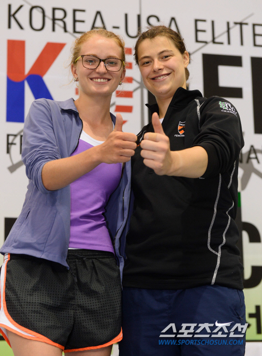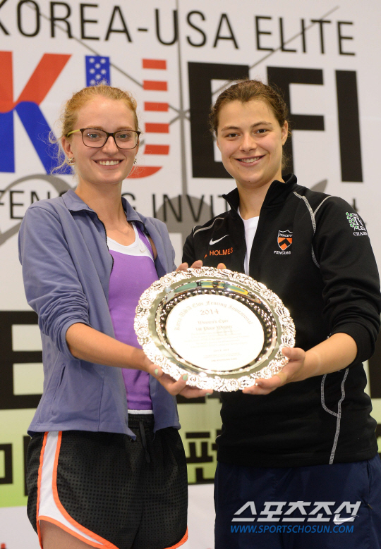 제4회 한미대학펜싱선수권(2014 KUEFI)대회 개인전 준결승과 결승경기가 9일 수원실내체육관에서 열렸다. 프린스턴대 애나 반 브루멘(지질학 전공)과 프린스턴대 국가대표 캐서린 홈스(여자에페 금메달, 의학 전공)가 포즈를 취하고 있다. 수원=최문영 기자 deer@sportschosun.com /2014.07.08/