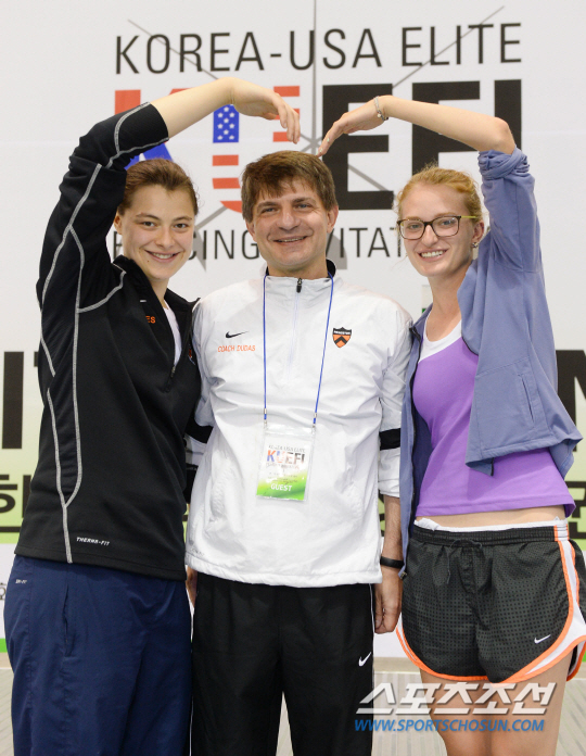 제4회 한미대학펜싱선수권(2014 KUEFI)대회 개인전 준결승과 결승경기가 9일 수원실내체육관에서 열렸다. 프린스턴대 애나 반 브루멘(지질학 전공)과 프린스턴대 국가대표 캐서린 홈스(여자에페 금메달, 의학 전공)가 졸탄 두다스 프린스턴대 감독과 포즈를 취하고 있다. 수원=최문영 기자 deer@sportschosun.com /2014.07.08/