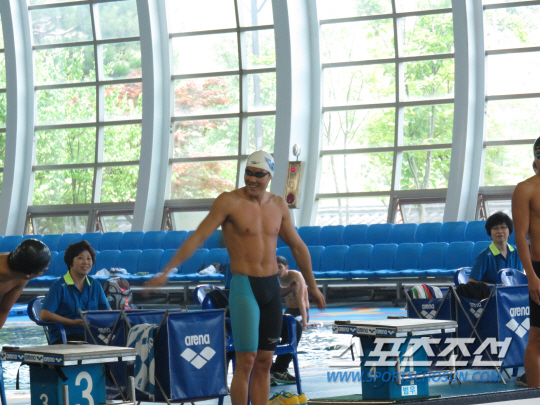 인천아시안게임 경영대표 선발전이 열리고 있는 김천실내체육관은 생활체육인들에겐 더없이 좋은 환경이지만 엘리트선수를 위한 국제규격의 수영장은 아니다. 50m 레인, 8개의 레인을 확보했지만, 수심이 1.3m로 올림픽 등 국제경기 규격 1.98m에 크게 못미친다. 선수들이 턴 동작을 할 때 발이 바닥에 닿을 정도다. 스타트 반응속도과 기록을 좌우하는 스타트 블록 역시 국제규격이 아니다. 이날 30도를 넘나드는 폭염속에 지난 10월 전국체전이 열린 인천 문학박태환수영장에 비해 열악한 환경에서 좋은 기록을 냈다.