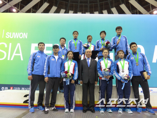 ◇손길승 대한펜싱협회장이 7월초 아시아펜싱선수권 남자에페, 여자사브르 단체전 시상식 직후 선수 및 코칭스태프들과 기념사진을 찍고 있다.