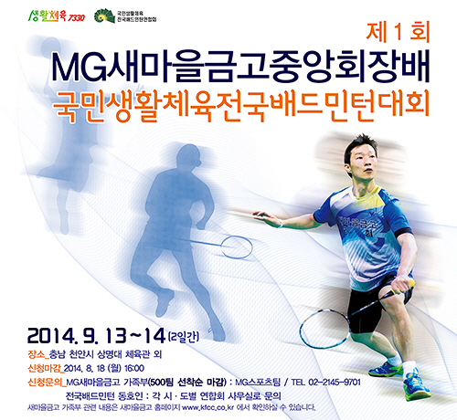 새마을금고중앙회가 국민건강의 증진과 생활체육 배드민턴의 저변확대를 위하여 오는 9월 13일부터 9월 14일까지 이틀 동안 천안시 상명대체육관 등 3곳에서 제1회 MG새마을금고중앙회장배 국민생활체육 전국배드민턴대회를 개최한다.