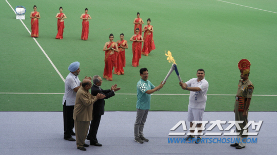 인도 여사제 17명이 채화경을 둘러싼 가운데 주사제가 오목거울에 태양열을 모아 성화봉에 불을 붙였다. 성화는 인도 대표, OCA 대표, 조직위 대표의 순으로 전달됐다. 첫 성화 봉송의 영광은 인도 레슬링선수 수실 쿠마르에게 돌아갔다. 김영수 위원장과 박선규 성화봉송단장을 거쳐 쿠마르에게 건네진 성화는 이후 40명(인도 대표주자 30명, 한인회장 등 10명)의 주자들에 의해 인디아게이트를 지나 대통령궁 등 뉴델리의 중심부 성화 봉송로 7㎞구간을 통과했다. 특히 한국전쟁 직후 제3국행을 선택한 반공포로 출신 인도 교민 현동화옹(81)이 봉송주자로 참여해 눈길을 끌었다.