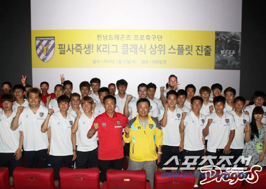 프로축구단도 '명량 마케팅'이 한창이다. 전남 진도 울돌목에서 가장 가까운 프로축구단 전남 드래곤즈의 올시즌 모토는 명량의 정신인 '필사즉생, 필생즉사'다. 지난 2월 새 시즌 출정식도 울돌목 앞바다에서 가졌다. 홈구장인 전남 광양구장엔 언제나 이순신 장군의 얼굴과 '필사즉생'이 씌어진 대형걸개가 나부낀다. 홈경기가 있는 날이면 출정기도 어김없이 내걸린다. 지난달 30일 '명량' 개봉일에 맞춰 선수단 전원이 영화를 관람했다. 필승 의지를 다졌다.