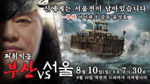10경기 연속 무승 부진에 빠진 부산 아이파크 역시 '명량 마케팅'으로 사기 진작에 나섰다. 10일 K-리그 클래식 20라운드, 13일 FA컵 8강전 등 FC서울과의 연속 2연전을 앞두고 '신에게는 아직 서울전이 있습니다'라는 패러디 포스터가 등장했다. 이순신 장군이 선조에게 절박한 심정으로 띄운 '신에게는 아직 12척의 배가 있습니다'라는 편지를 패러디했다. 이순신 역의 배우 최민식 대신 윤성효 부산 감독의 사진을 합성했다. 수원 감독 시절 유독 서울에게 강했던 윤 감독의 '반전 승리'를 향한 염원을 담아냈다. 전영지기자 sky4us@sportschosun.com