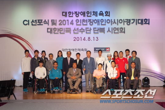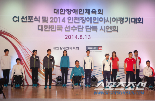 대한장애인체육회는 13일 오전 10시 30분 서울 서대문구 그랜드호텔 컨벤션홀에서 CI 선포식 및 2014 인천장애인아시안게임 대한민국 선수단 단복 시연회를 개최했다. 장애인 육상스타 홍석만(39), 휠체어테니스 박주연(34), 휠체어농구 김호용(42), 수영 전미경(43), 배드민턴 김기연(24), 조정 선진(19) 등 인천장애인아시안게임을 위해 땀 흘리고 있는 장애인 국가대표 선수들이 직접 '유니폼 모델'로 나섰다.