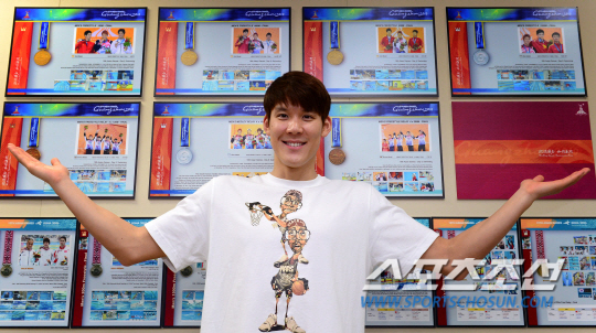 박태환이 도하, 광저우아시안게임에서 따낸 메달 앞에서 포즈를 취하고 있다. 개포동=송정헌 기자 songs@sportschosun.com