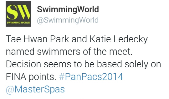 팬퍼시픽수영선수권 주최측은 24일 오후 대회 종료 직후 '대회 최우수 수영선수(swimmers of the meet)'로 박태환과 케이티 레데키(미국)를 선정했다.
