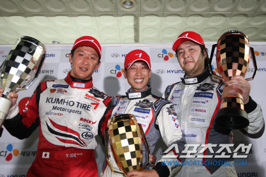 13일 태백레이싱파크에서 열린 'CJ헬로모바일 슈퍼레이스 챔피언십' 6라운드에서 슈퍼6000 클래스 우승자인 김의수(가운데), 2위 이데 유지(왼쪽), 3위 황진우가 시상대에 올라 기쁨을 나누고 있다. 사진제공=슈퍼레이스