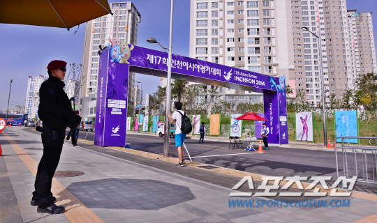 인천 아시안게임 개막을 3일 앞 둔 16일 오후 인천 구월동 구월아시아드선수촌에서 경찰 특공대가 삼엄한 경계를 펼치고 있다.
